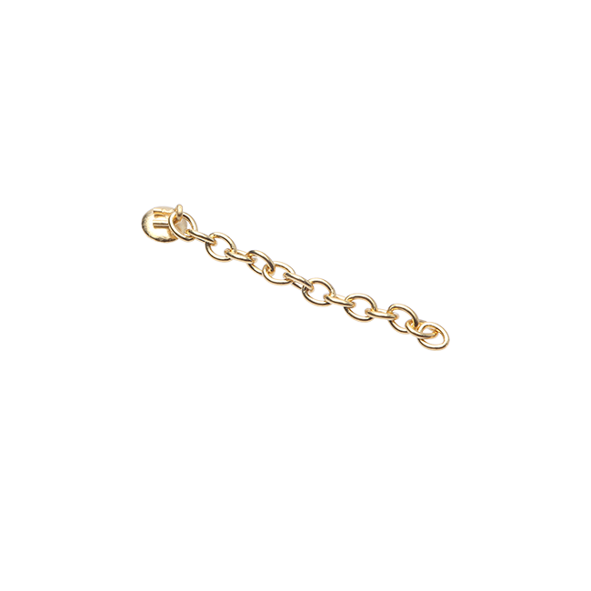 Extrusion chain used to Bondable to Cuspid impacted palatally on labially. The traction chain swings freely within eyelet. The 0.022" inner diameter chain can be tied to the archwire with elastic thread or tubing to provide traction in the desired direction. 3.5mm diameter (Flat)-80 gauge foil mesh base assures reliable bonding. Lower profile limits irritation, 18k gold panting hook and chain can reduce allergic reactions.